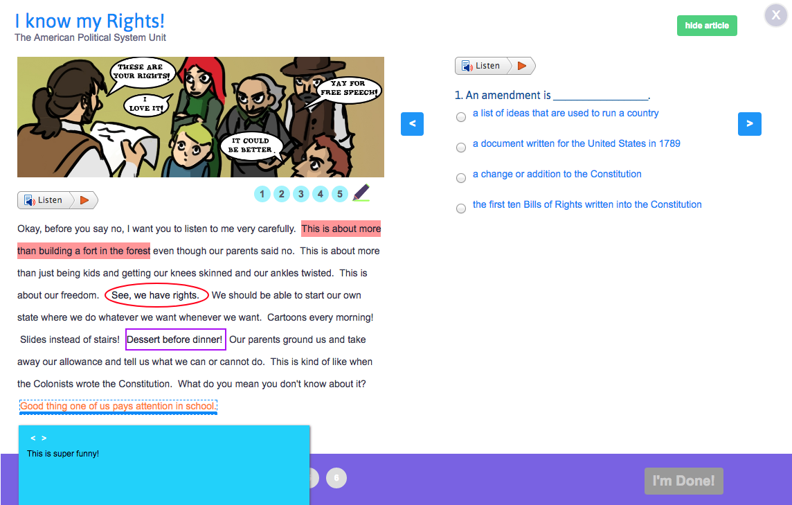Students at lower reading levels or those who need to can listen to the article while following along as text is highlighted.